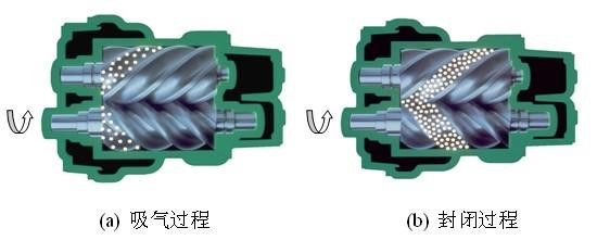 螺桿式空氣壓縮機的工作原理:電機驅(qū)動轉(zhuǎn)子,主從轉(zhuǎn)子的齒溝空間在轉(zhuǎn)至進(jìn)氣端壁開口時,其空間大,外界的空氣充滿其中,當(dāng)轉(zhuǎn)子的進(jìn)氣側(cè)端面轉(zhuǎn)離了殼之進(jìn)氣口時,在齒溝間的空氣被封閉在主、從轉(zhuǎn)子與機殼之間,完成吸氣過程。在吸氣結(jié)束時,主、從轉(zhuǎn)子齒峰與機殼形成的封閉容積隨著轉(zhuǎn)子角度的變化而減少,并按螺旋狀移動,此為壓縮過程。在輸送過程中,容積不斷減少,氣體不斷被壓縮,壓力提高,溫度升高,同時,因氣壓差而變成霧狀的潤滑油被噴入壓縮腔,從而達(dá)到壓縮、降低溫度密封和潤滑的作用。當(dāng)轉(zhuǎn)子之封閉齒峰旋轉(zhuǎn)到與機殼排氣口相遇時,被壓縮的空氣開始排放,直到齒峰與齒溝的吻合面移至排氣端面,此時齒溝空間為零,即完成排氣過程。與此同時,主從轉(zhuǎn)子的另一對齒溝已旋轉(zhuǎn)至進(jìn)氣端,形成大空間,開始吸氣過程,由此開始一個新的壓縮循環(huán)。